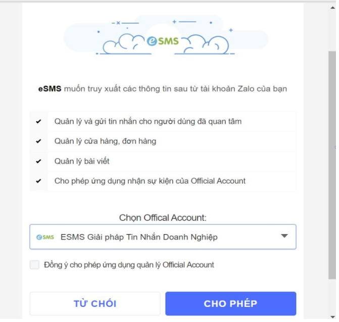 B4: Tiếp theo bạn sẽ thấy màn hình xin quyền kết nối giữa eSMS và Zalo OA